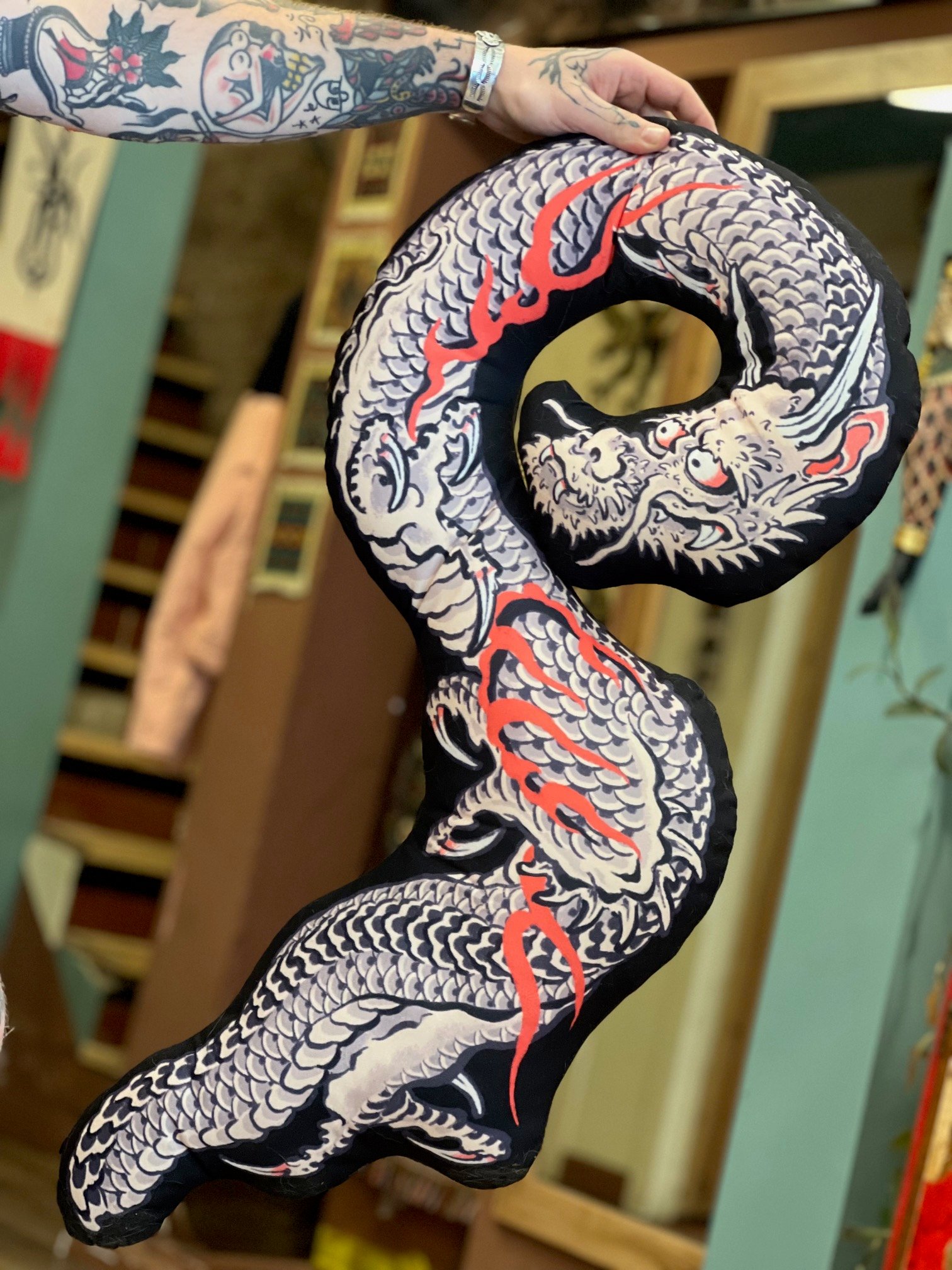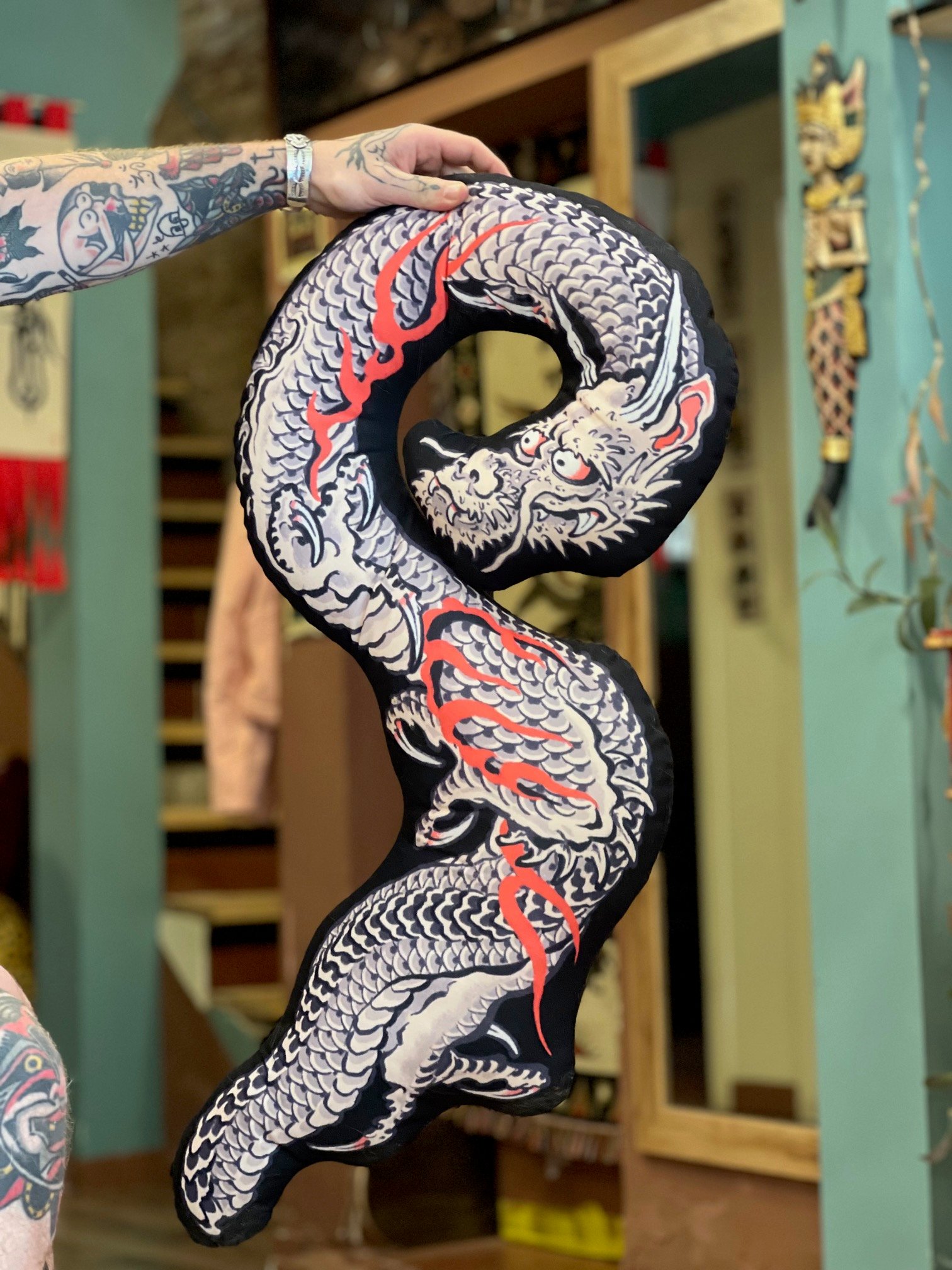 Travel pillow with dragon print on both sides